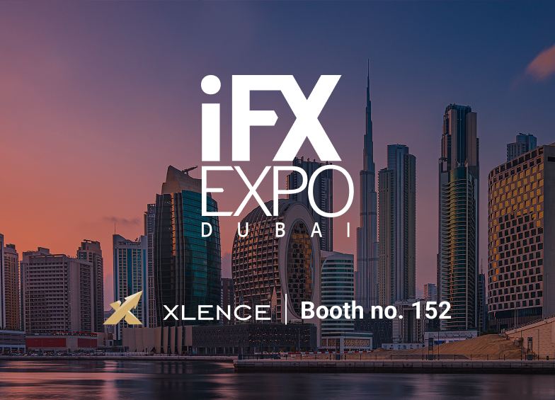 Golden podium-style bars with the Xlence logo, a speech bubble icon, and a globe, symbolizing global trading growth and important market events.