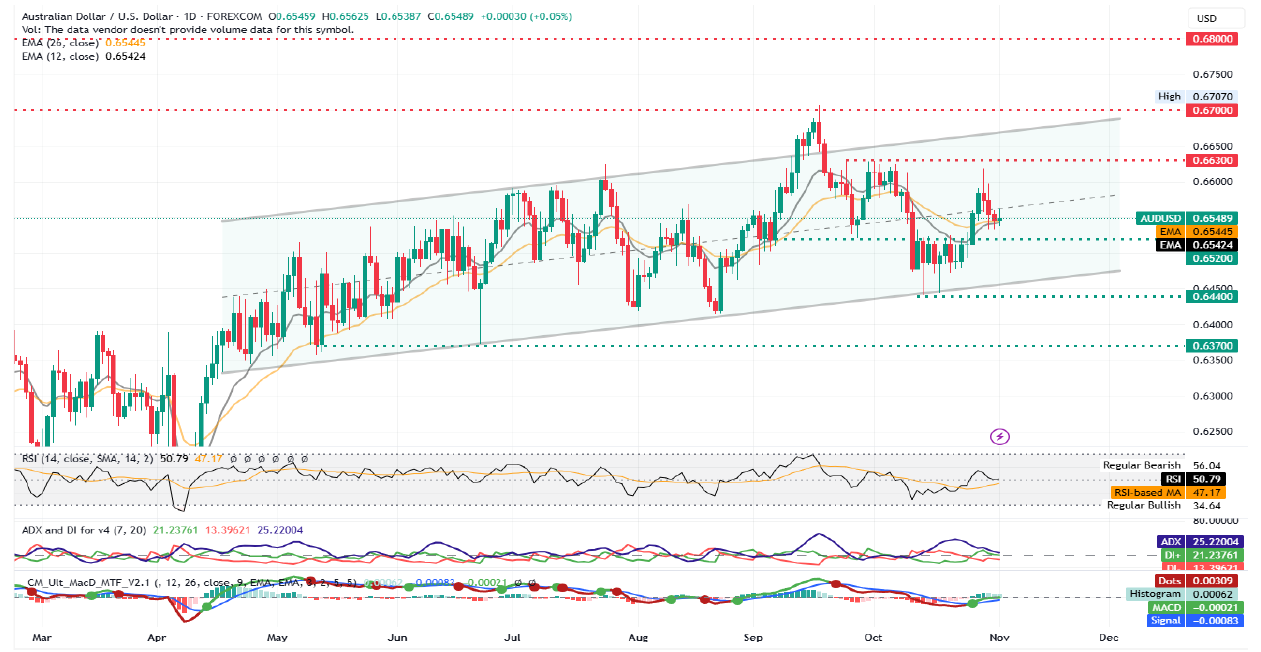 AUDUSD Chart – The Australian dollar gyrates near the $0.65 area against the greenback ahead of RBA policy meeting