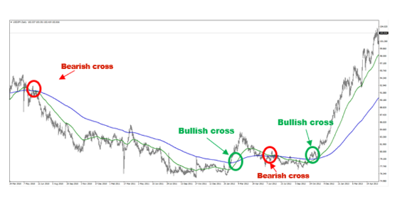 - Utilizando dos medias móviles: una tendencia alcista se señala cuando una media móvil a corto plazo cruza por encima de una media móvil a largo plazo. Una tendencia bajista se indica cuando la media a corto plazo cruza por debajo de la media a largo plazo.